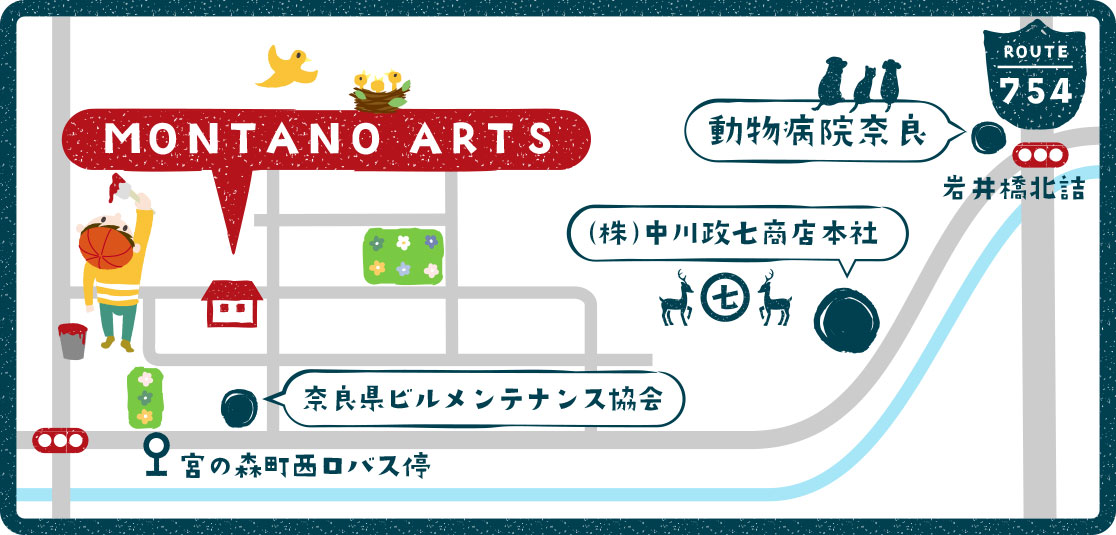 岩井橋北詰交差点を川沿い西へ下り、信号手前の奈良県ビルメンテナンス協会を北へ、宮の森住宅に入って十字路2つ目の角です。教室前の駐車場(最大 5 台)をご利用ください。